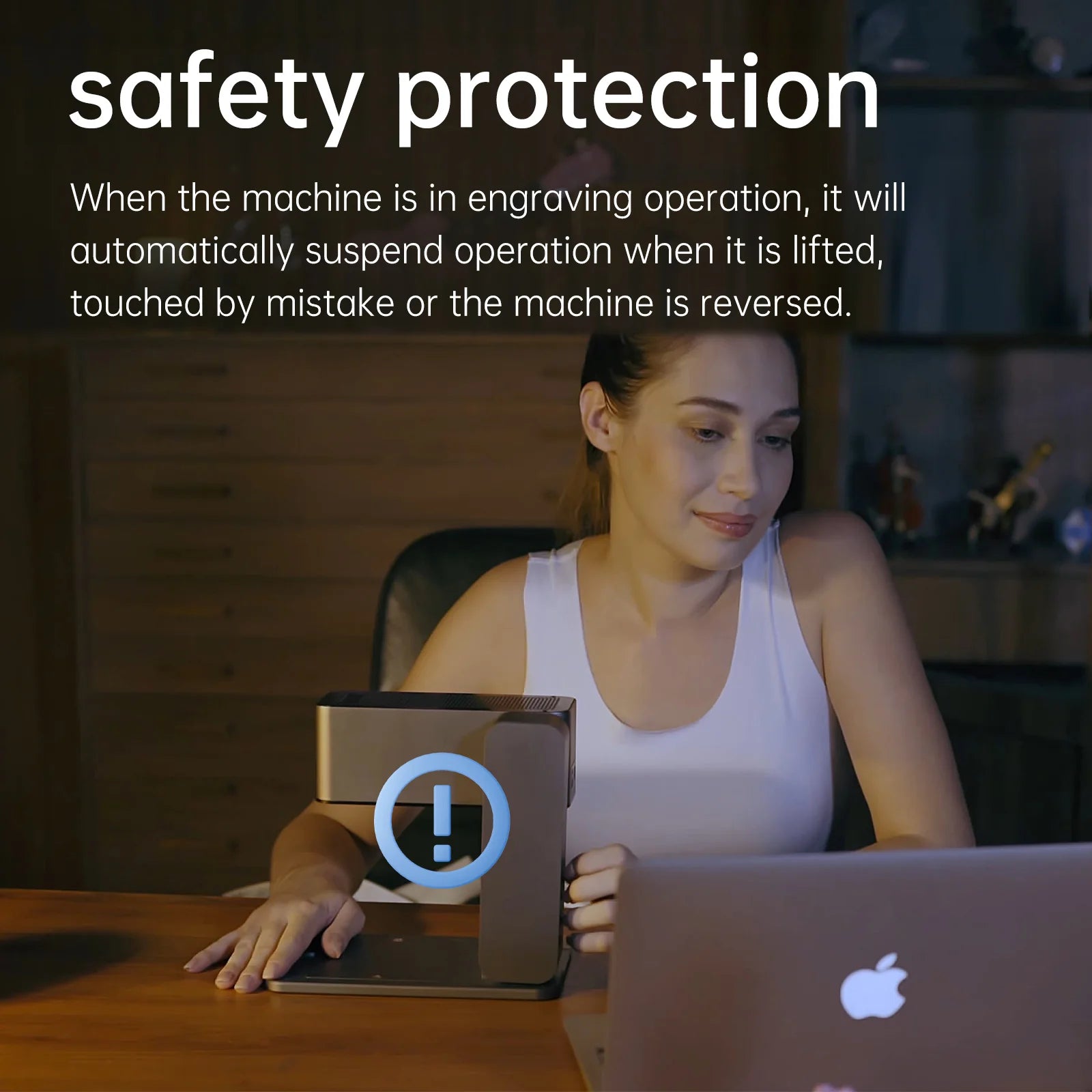 Benefit: If the machine is lifted, touched by mistake (bumped), or reversed/tilted significantly during operation, the system automatically and instantly suspends (shuts off) the laser beam. This is a crucial safety feature to prevent the powerful laser from accidentally shining into eyes, onto flammable materials, or ruining the work piece due to movement.